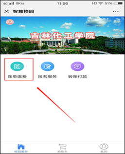 第二步:关注公众号后进入首页,点击左下角菜单 “智慧校园”;